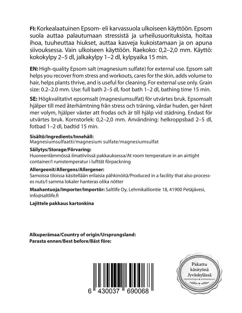 Korkealaatuinen, helposti veteen liukeneva Epsom suola auttaa palautumaan stressistä ja urheilusuorituksista. Sopii rentouttaviin kylpyihin, jalkakylpyihin, ihon kuorintaan, hiuspohjan pesuun sekä kodin siivoukseen. Kasveille Epsom-suolaa käytetään vain tarvittaessa magnesiumin puutostilanteissa (esim. lehtien kellastumista suonten välistä etenkin vanhoissa lehdissä).
